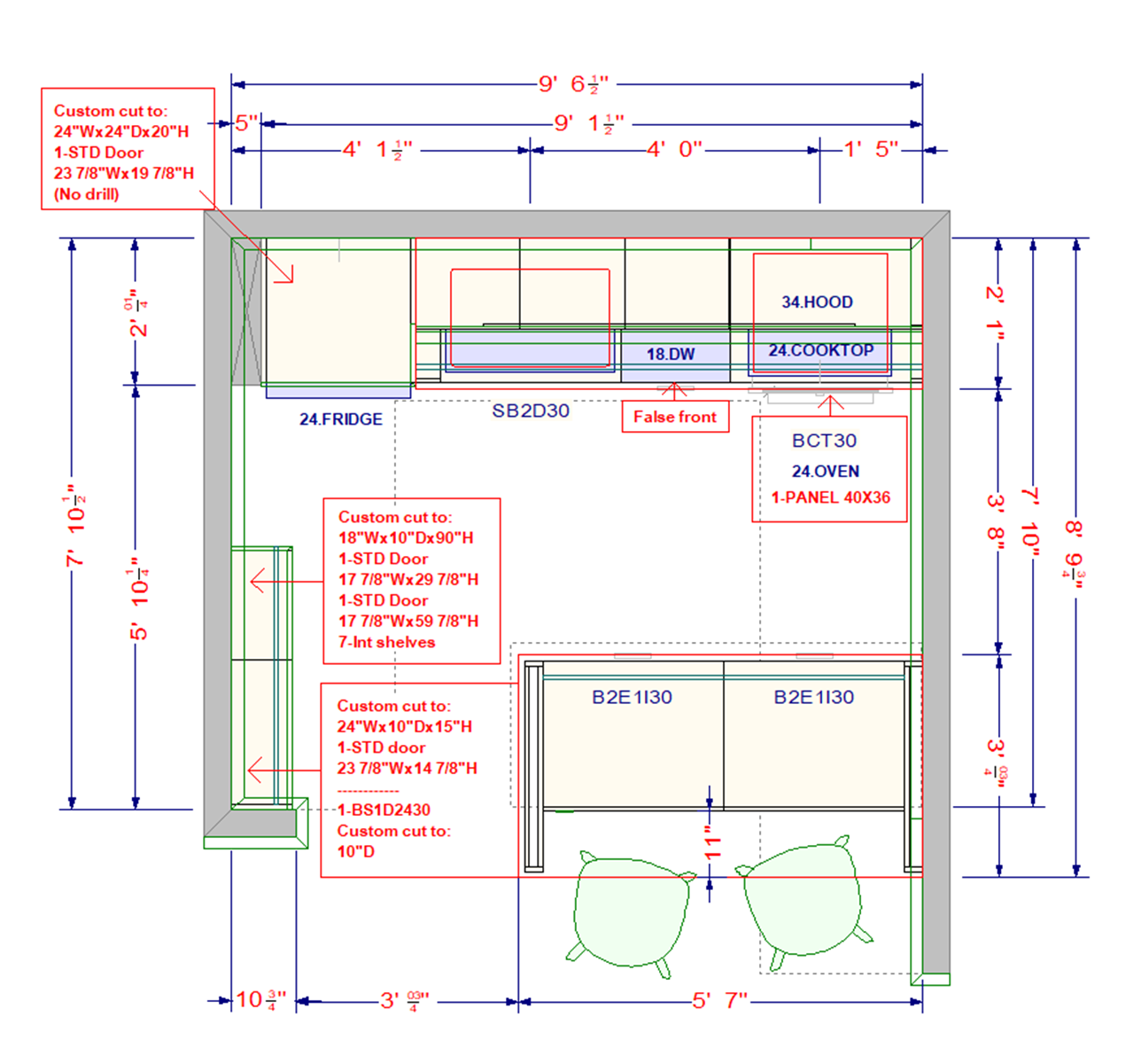 Lastly, Casey wanted to store her microwave above the refrigerator. Although IKEA didn’t have the right kitchen cabinet in stock, Javier modified a base cabinet by cutting it to the desired height and adding a panel on top. In the end, a custom cabinet measuring 24″(W) x 24″(D) x 20″(H) was created, giving the design a seamless, built-in appearance.